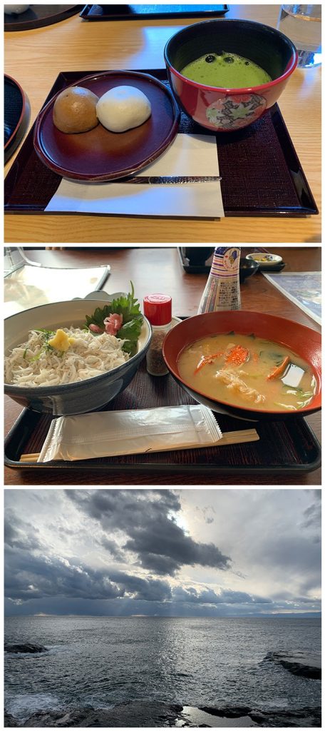 この写真は江ノ島神社に行ったときの海とお店の飯の写真です。