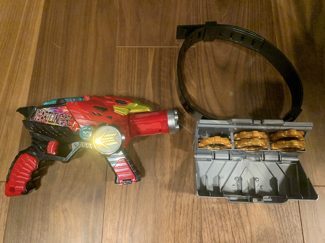 息子はお願いしていた「ギアトリンガー(銃)」に絶叫し、目を疑うほど包装紙と箱の破片を床にぶちまけながら開封し、「ギアトリンガー(銃)」をキラメイレッドの如く装備していました。