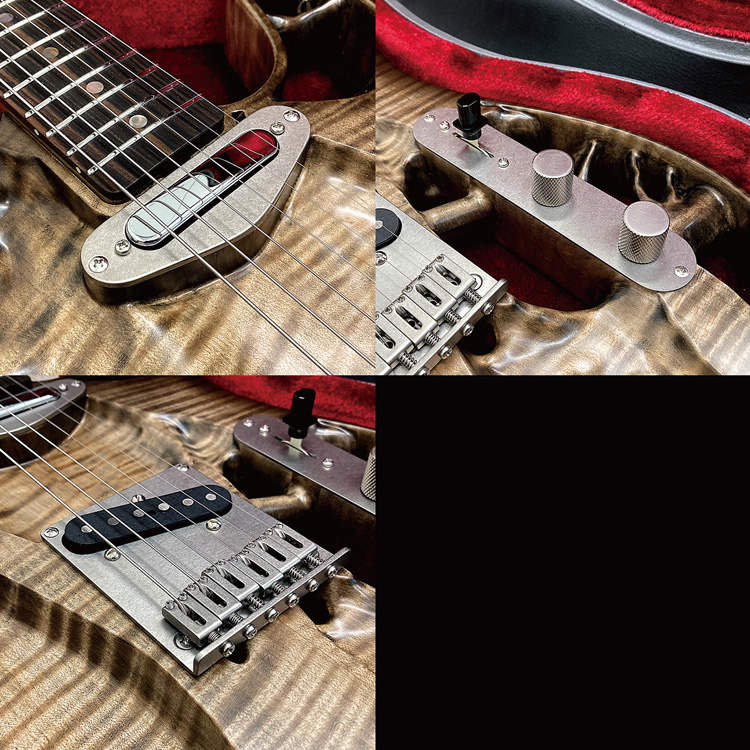 トラスロッド、ジョイントプレート、ピックアッププレート、ブリッジ、サドル、ブッシュ、コントロールプレート、ノブ、ジャックカップ、すべて職人の技術により製作された特注品で軽量化を追求。