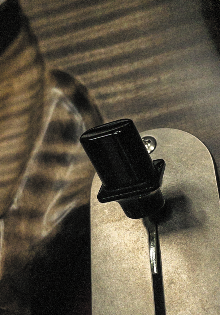 U-I.D GUITARS 工房内で精密に削り出し、丹念に磨き上げたアクリル製のスイッチノブを採用。